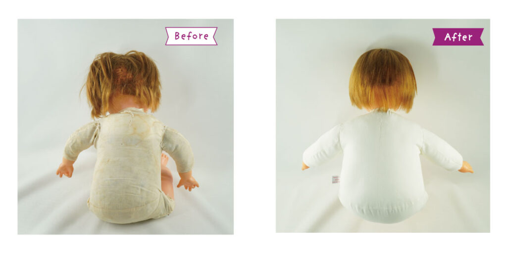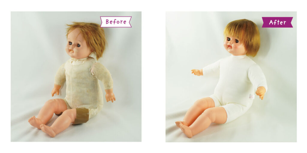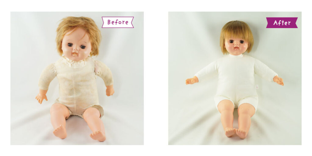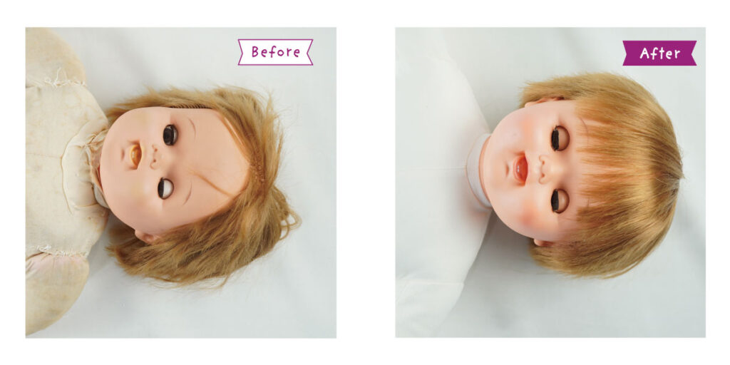 *顔・手・脚・ソフトビニール部分のクリーニング *髪の毛のシャンプー・セット *目の治療 *顔の彩色直し *布ボディの新調