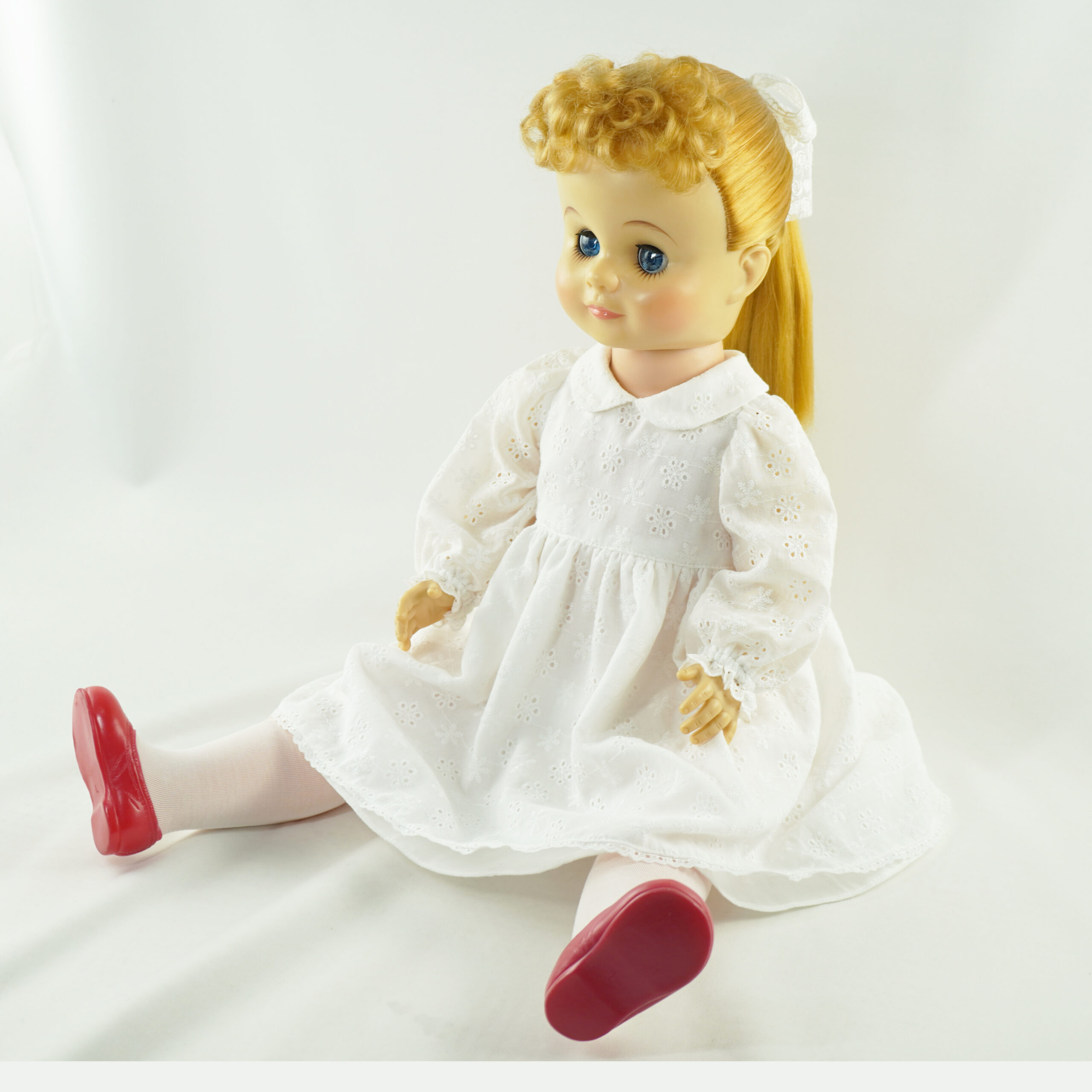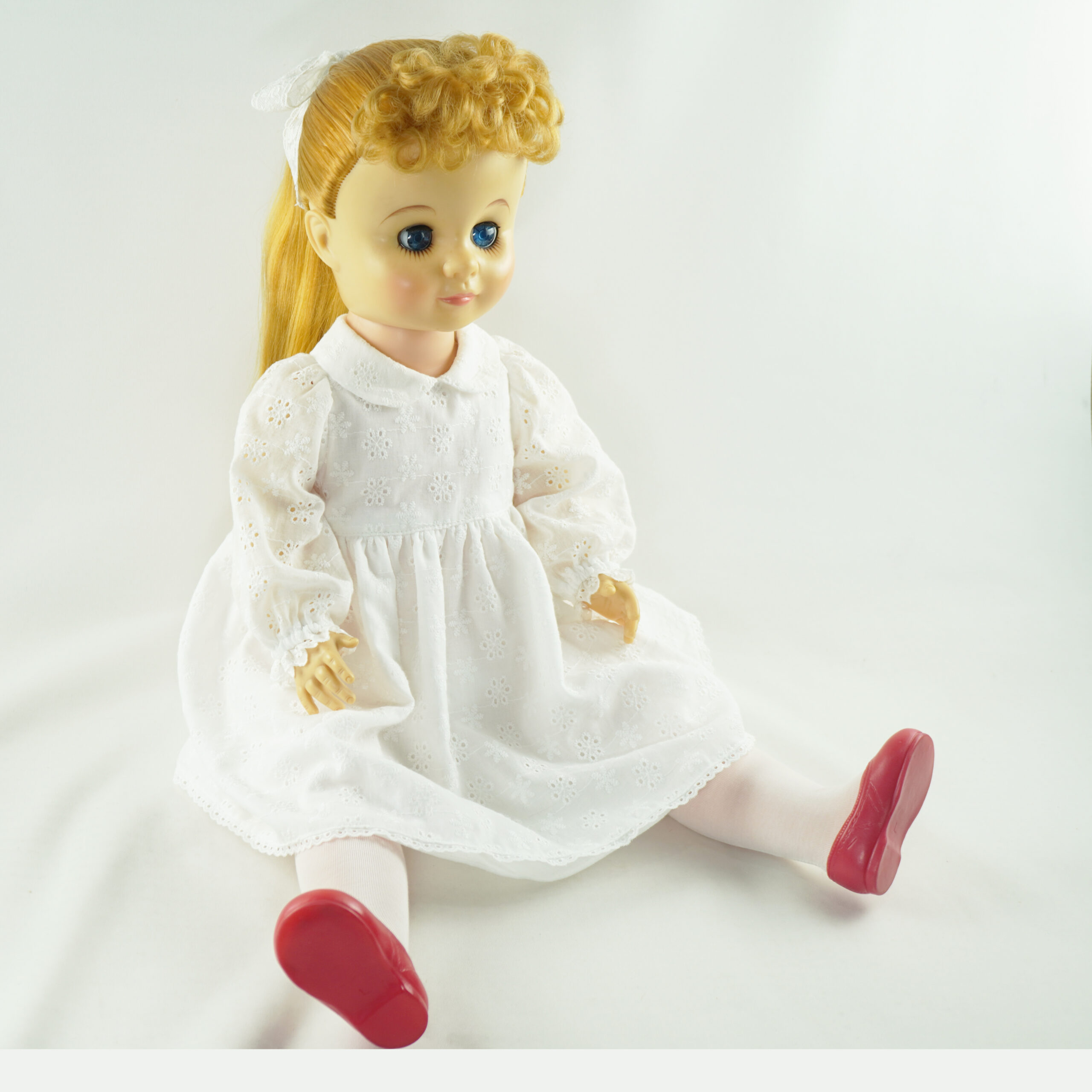大きな歩行人形のいでこちゃん、とっても元気になりました。 元々着ていたステキなお洋服をクリーニング&補修しました。 良くお似合いですね!